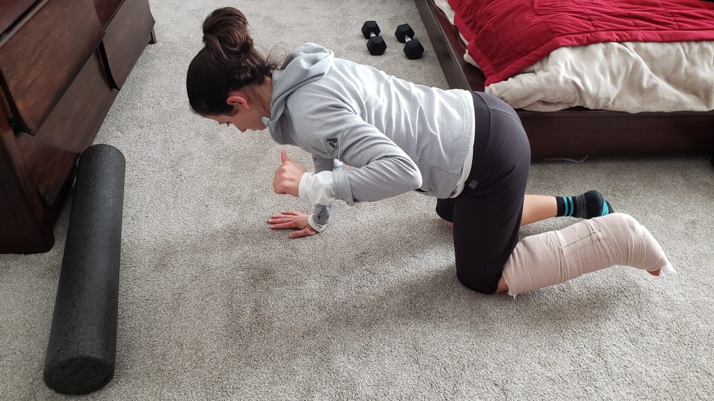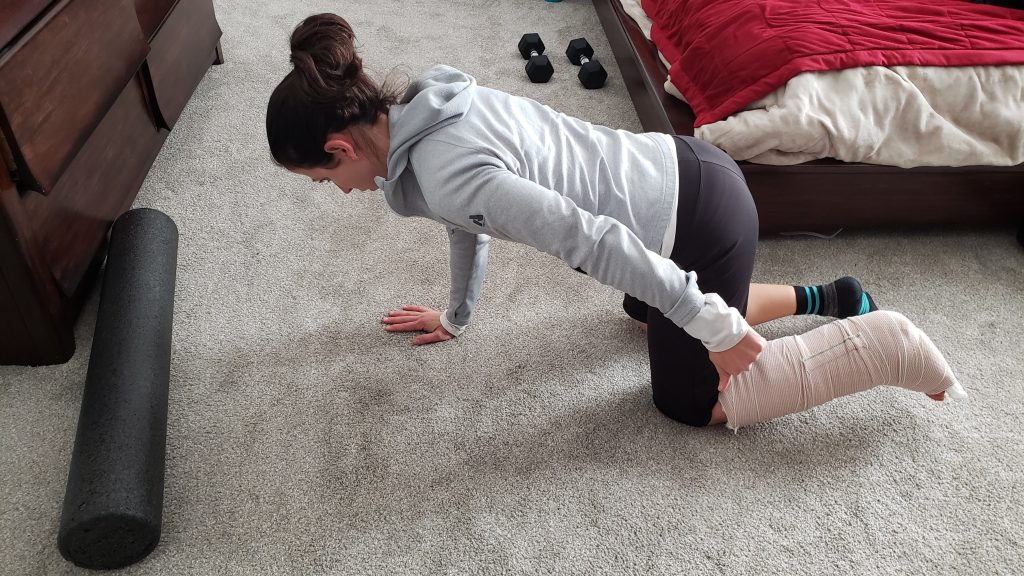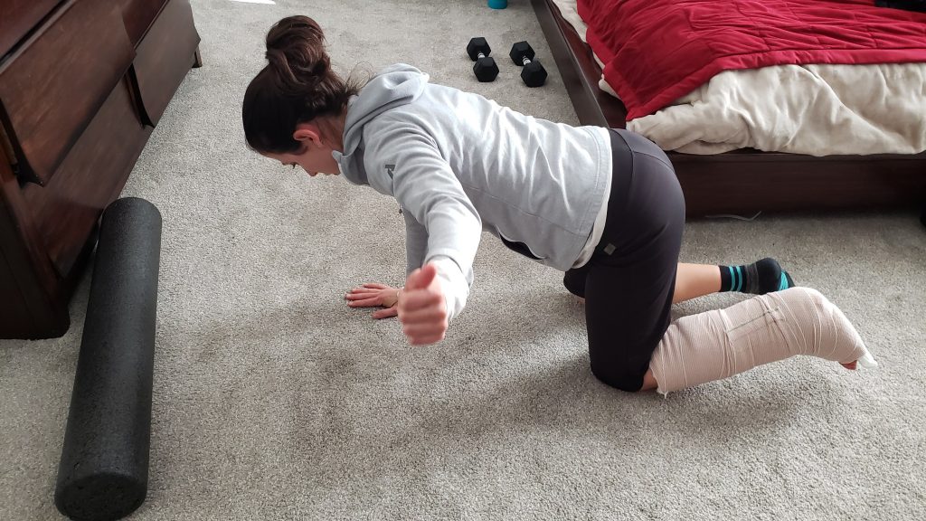 The surgeon says that all went well during the surgery! When he came to see me just before the surgery, he told me that if I came out with a boot on, I would be able to put weight in my ankle after 3 days, but if it was in a splint, it would be 10 days and he would let me know if for some reason it would be any longer. So, the first thing I did when I had started coming out of anesthesia was to lift the blanket and see and there was my leg in a splint. So, 10 days it is. Right after surgery, I had that super groggy feeling that I pretended wasn’t there because I just wanted to get home. The pain was tolerable, until I went to bed and then it was a struggle to find a comfortable position. The next morning, I had big intentions to get started on my upper body and glute strengthening, but I realized within minutes that I had been a little overly ambitious with that thought. I was queasy every time I tried to get up. I did a few leg lifts and called it good. I could feel my body rebelling from the withdrawal that comes with a sudden change in activity level with added aches and a general feeling of yuckiness. I spent the day trying to cope with the pain and ignore my urge to get up and run around. That night I decided I couldn’t manage without pain meds and took Ibuprofen so I could finally sleep, which I did, thankfully. Day 3 (this morning) I started on some light exercises. I just did them in my bedroom, but even so, it felt good to move some. I have listed the exercises below. Don’t judge my pictures- I just had surgery and I have 4 young kiddos.